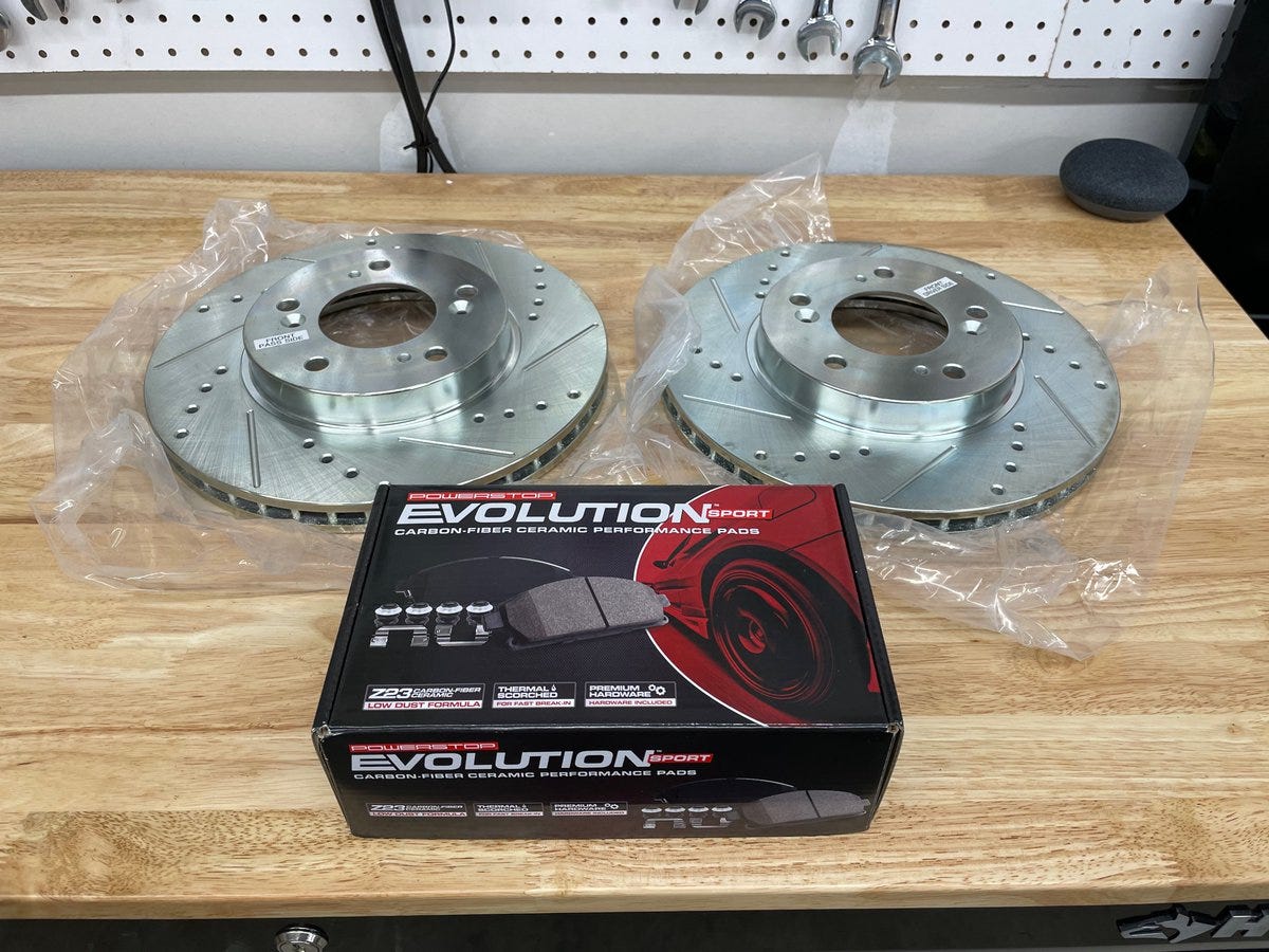 That’s what’s happening in this ’99 Prelude so I’m installing new PowerStop drilled/slotted rotors and PowerStop carbon-fiber ceramic pads.