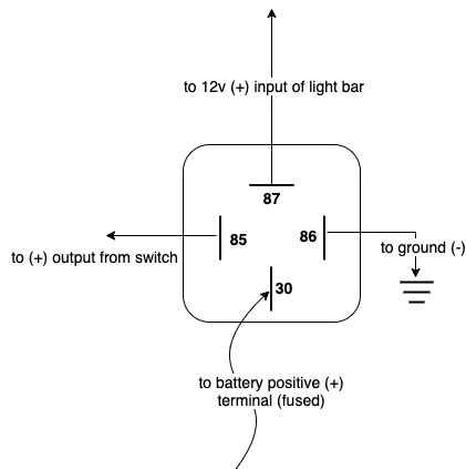 The diagram below shows how I’ll be wiring the relay. Standard 4 or 5 pin relays will have their pins numbered this way. A 5-pin relay will have a 5th pin labeled 87a but is not needed for this application. This is typical for any kind of light or other high current device you might be putting in a vehicle. The other wire from the light, the negative input, will of course be grounded to the chassis just like pin 86. If you want more detail about how relays work watch this video.