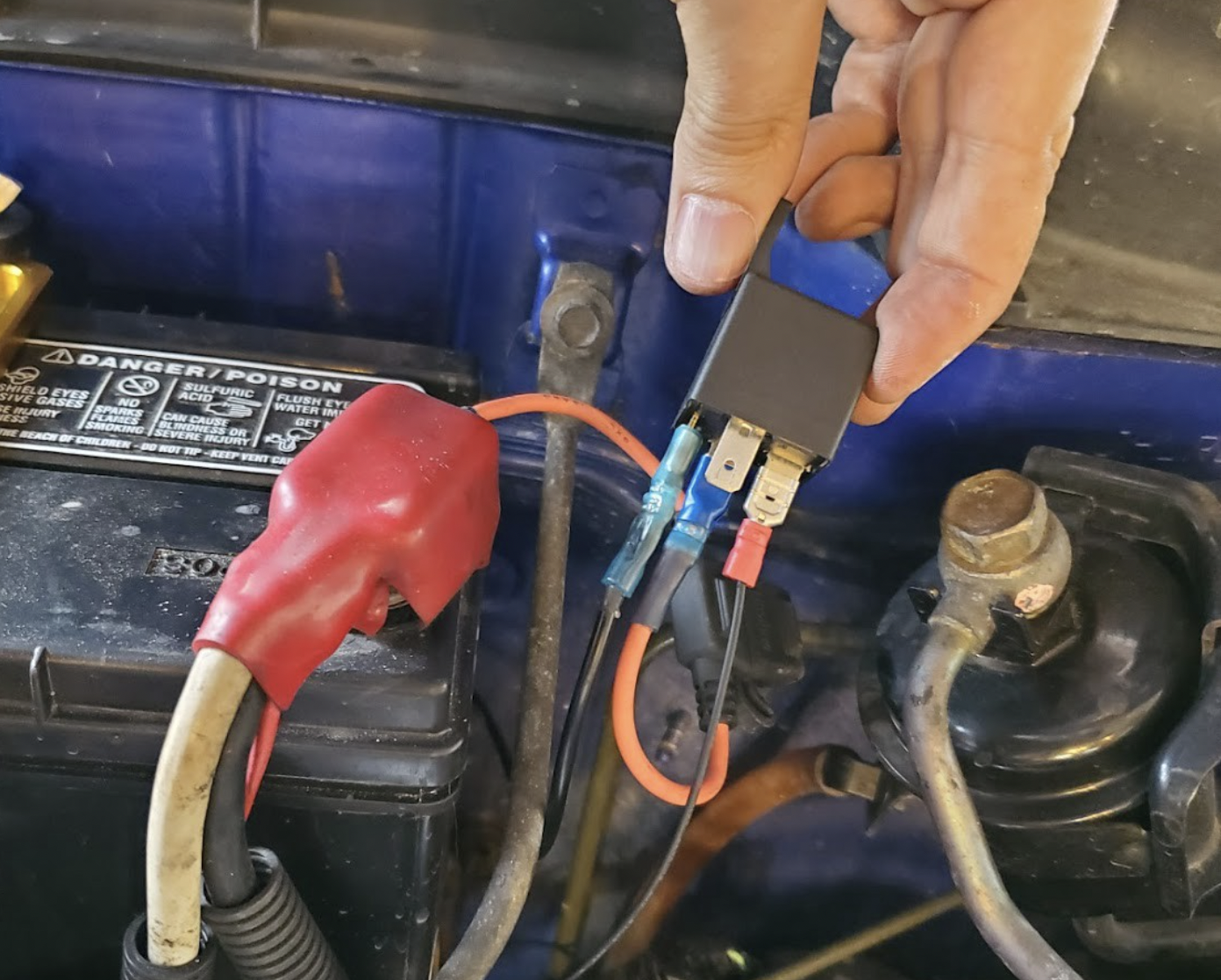 A relay is an electrically operated switch. It allows a low-current circuit (like a switch in your dash) to control a high-current circuit (like one to power lights). We use them instead of connecting our devices directly to the manual switch in the dash because it is inefficient and less safe to draw power for our device back and forth through the car and run it through a switch that is not rated for that much current in the first place.