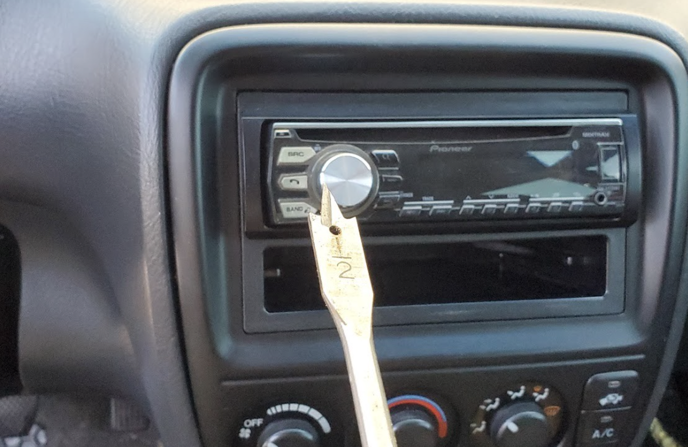 The switch panel is going to go over the second DIN location under my stereo. I’ll use this 1/2" paddle drill bit to make a hole in the back to pass wires through.