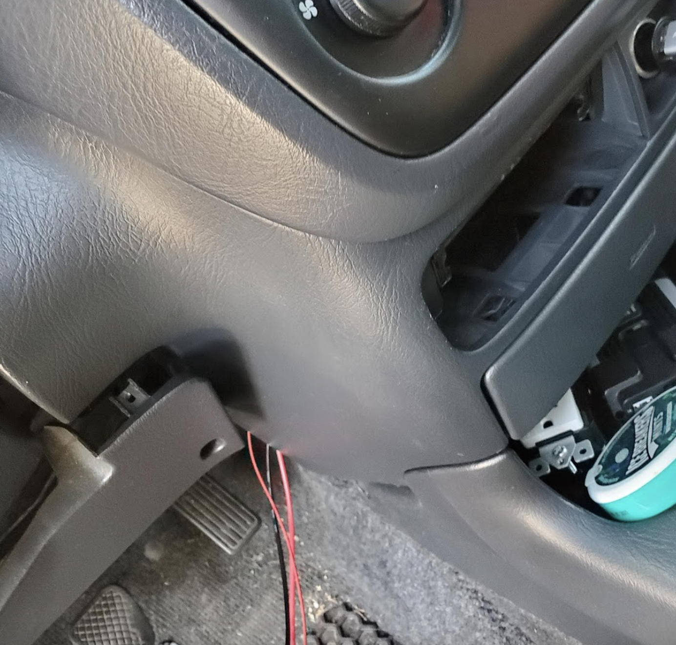And then I’ll remove a couple screws and scrape the skin off my knuckles trying to pass the wires through the hole I drilled and feed them down out the back of the console. This will vary wildly depending on the vehicle and where you mount your switch. It takes some creativity and experimentation.