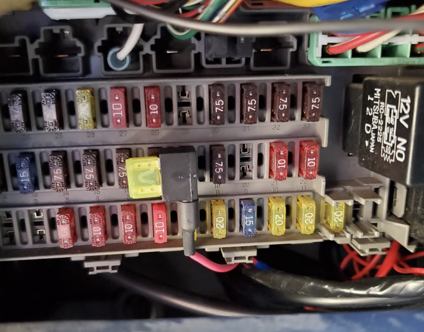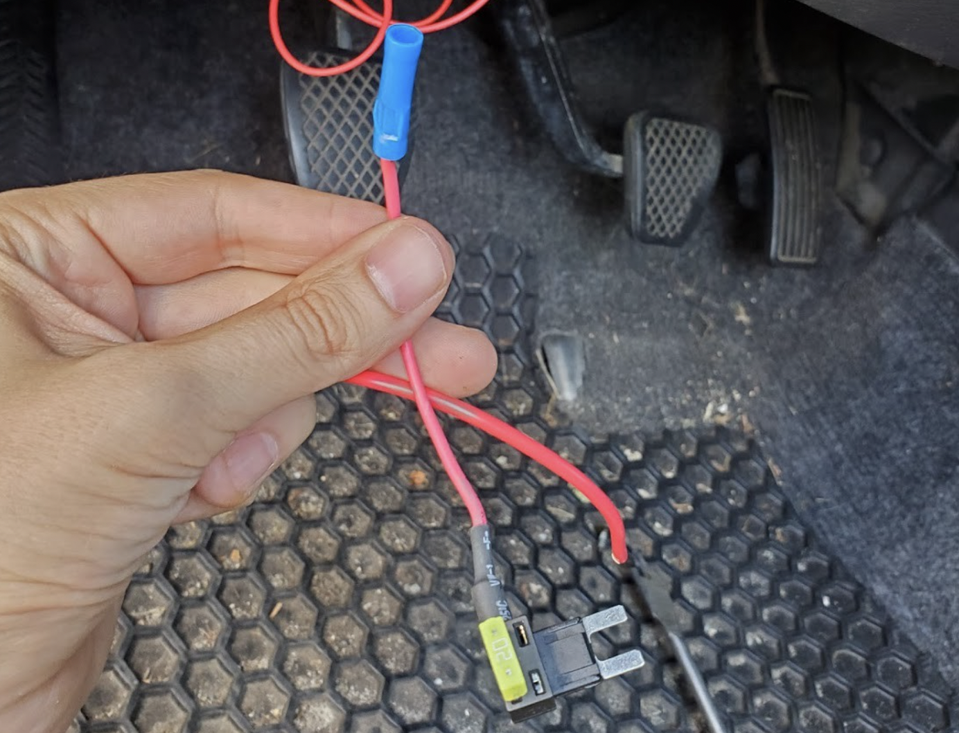 Now I have the input wires (positive and negative) as well as the output wire from one of the switches fed through my center console and exiting under the dash near the drivers feet. The output wire will eventually need to get to the relay under the hood but first let’s find input power. I want ignition switched power, power that is only “on” when the key is in the car. This way I don’t have to remember to flip any of these switches off when the car is off and there’s no risk of draining my battery. Fortunately, this Honda has empty locations on the under dash fuse box that provide ignition switched power. If it did not have this I would be splicing into the factory wiring harness to get ignition switched power. I’ll be using this “add-a-ciruit”, which is basically a fuse holder with a wire that plugs into a fuse box. Also, I should vacuum my floor mats.