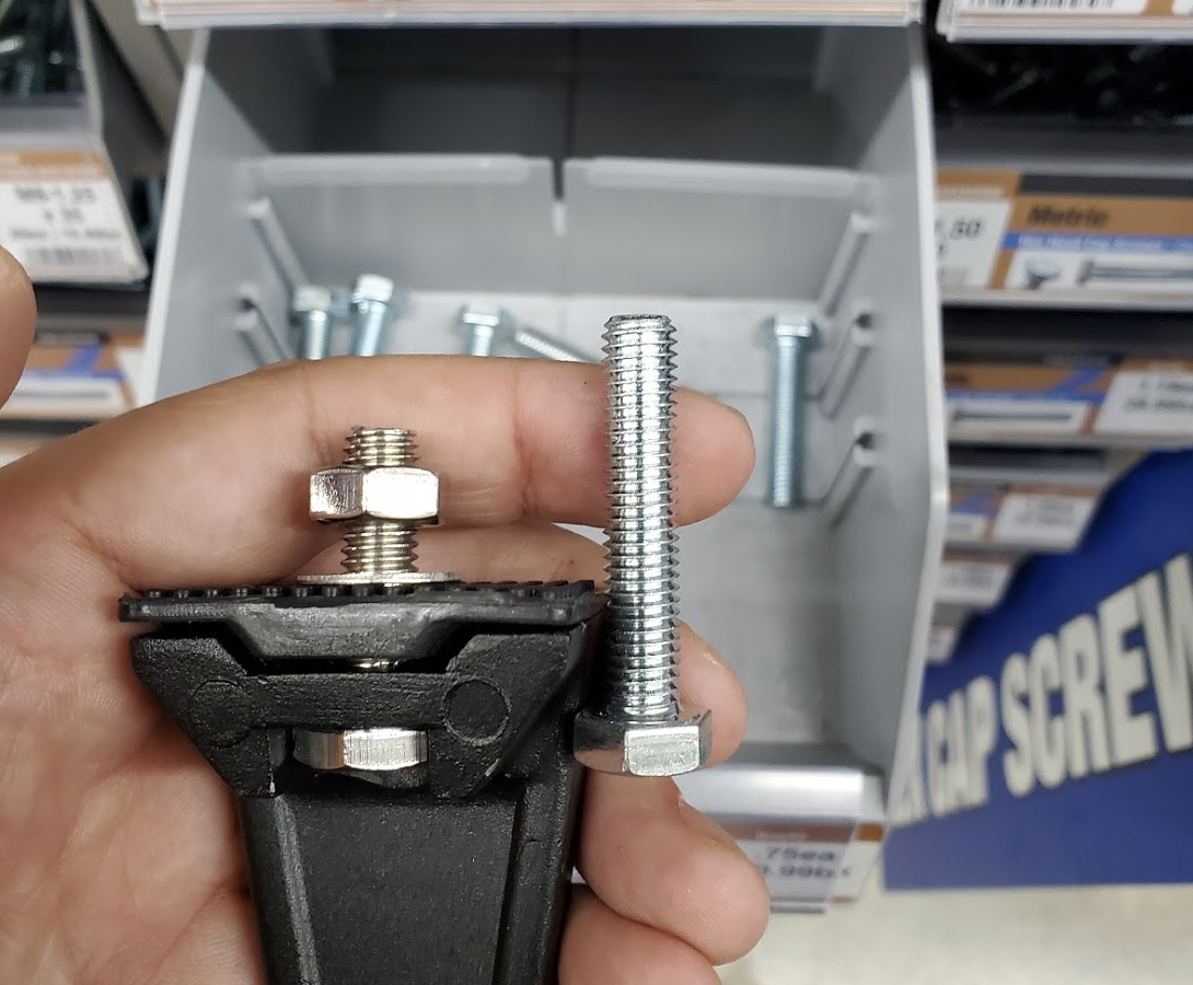 The light bar came with these M8 x 1.25 bolts (and nuts) that were intended to go through the thin sheet metal my roof. They’re not quite long enough for this thick bracket so I’ll need to get different longer ones.