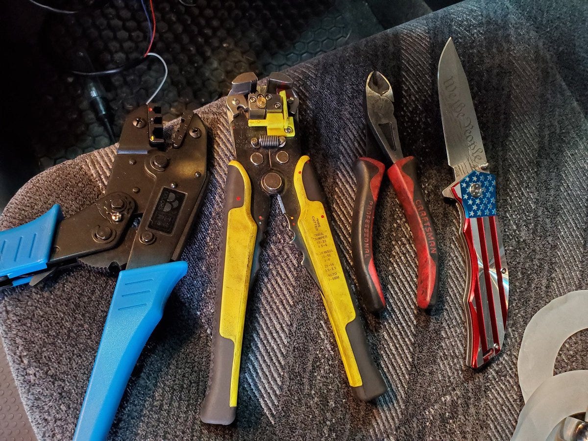 You can do electrical with just a razor blade and pliers but here’s the tools I’ll be using: a crimper, a self-adjusting wire stripper, snips and a Freedom knife.