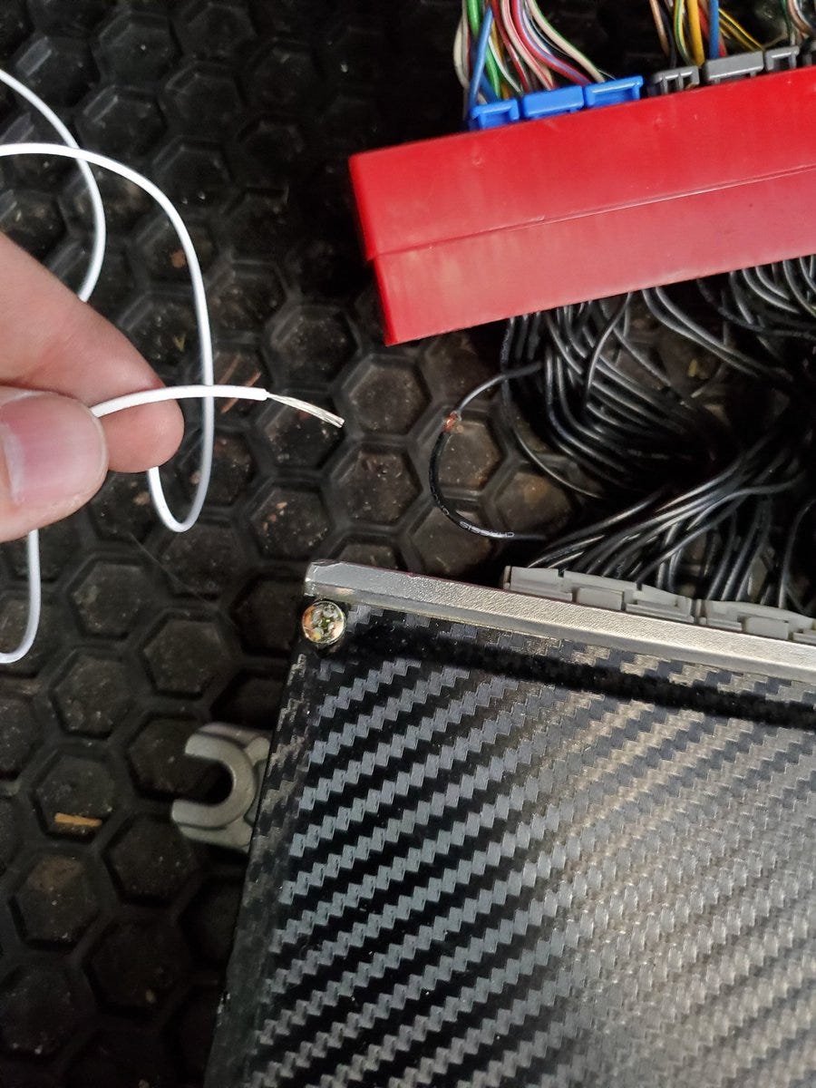 We could call this “done” except I want to take that data I’m getting back from the o2 sensor and send it to the ECU so it can actively improve the air/fuel ratio. I’ve extended the white wire from the air/fuel wideband so it can go over to the ECU on the passenger side. Here’s my engine computer with the wire I need to tap into already partially bared.