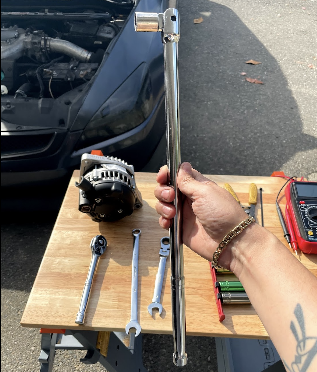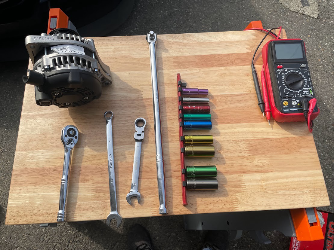 This job only requires very basic tools like wrenches and sockets. A breaker bar is a big plus (if you don’t have one you can extend your ratchet handle with a jack handle). A multimeter is handy to test your charging system afterwards but isn’t required.