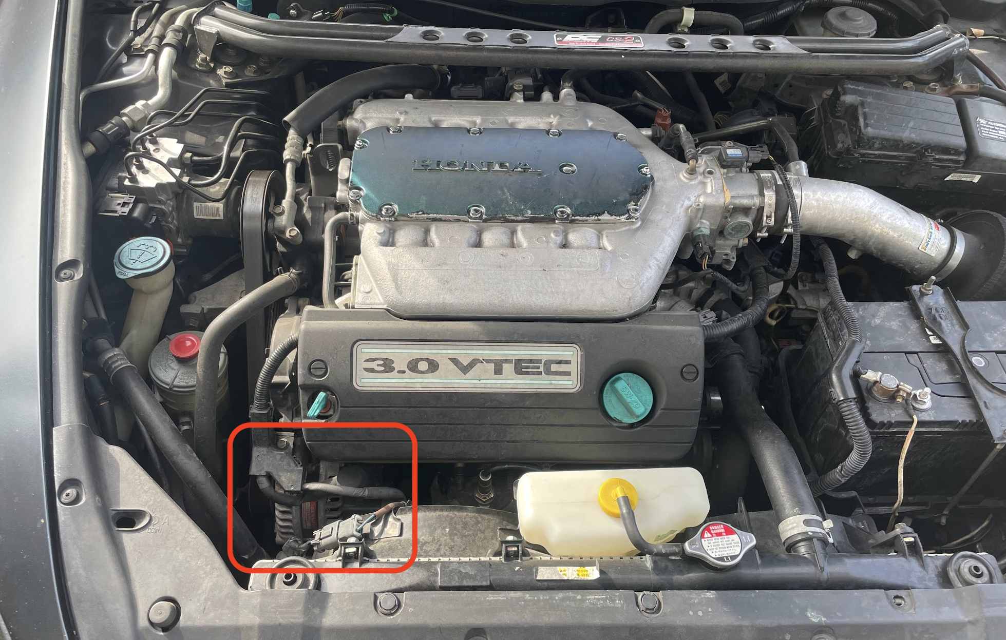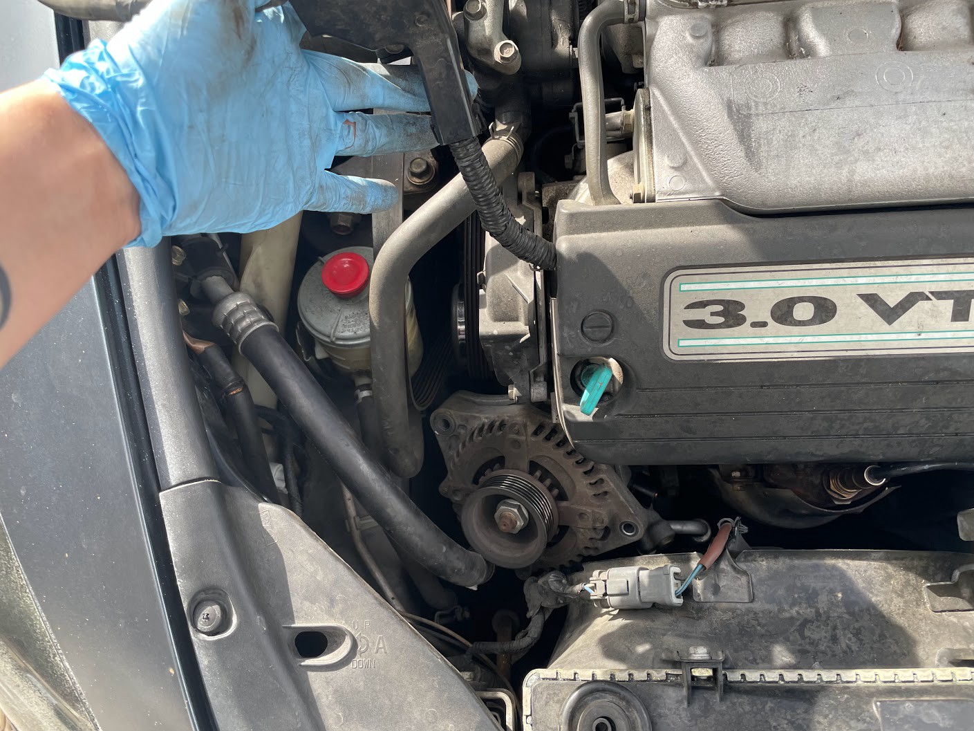 Now let’s locate the alternator. On cars of this era with a J-Series V6 (Accord, Odyssey, Passport, etc) the alternator is on the front of the engine on the passenger side. All alternators are located along the engine’s pulley/belt system so they are easy to find.