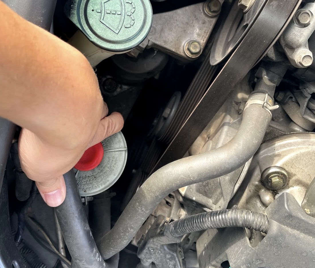 The next steps can be impeded by the brake fluid reservoir. It’s easy to find because of its red cap. Pull it out of the slot in the chassis so you can tuck it aside out of your way. You do not need to disconnect the brake fluid lines connected to it and spill brake fluid everywhere.
