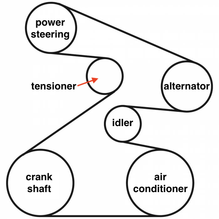 Next we need to take the belt off of the alternator. In order to do this we must release belt tension via the tensioner. Use this diagram to identify the tensioner pulley. It’s the higher up of the two smaller wheels.