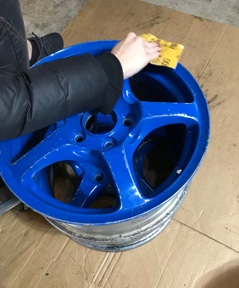 While I’ve been filling the other wheels my partner in crime has been wet sanding the blue wheels. They don’t need any body filler so she’s using a fine grit to prep the surface for primer and paint.