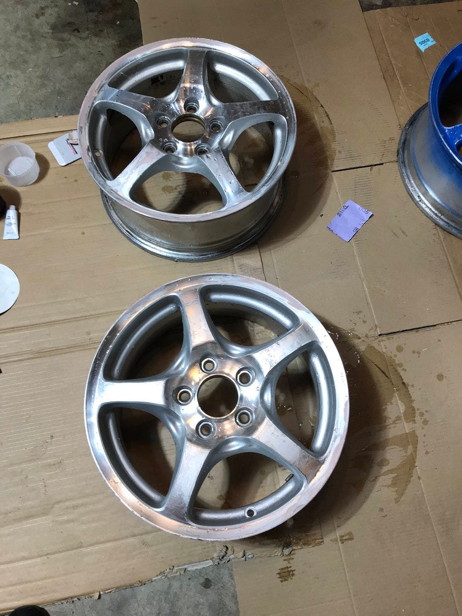 These are OEM 16” x 7.5" Honda S2000 wheels. They’re made in Japan by Enkei. They’re pretty sought after but I got this set for $120 on Craigslist because they are in rough shape and have no tires.