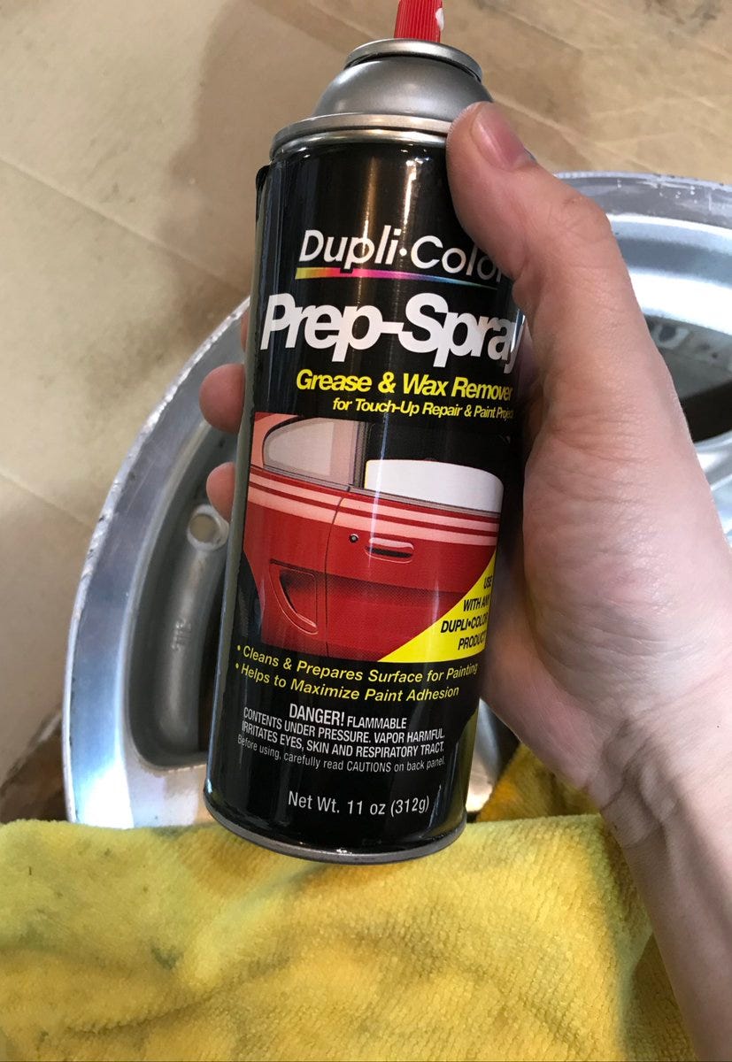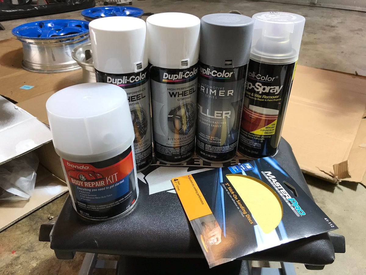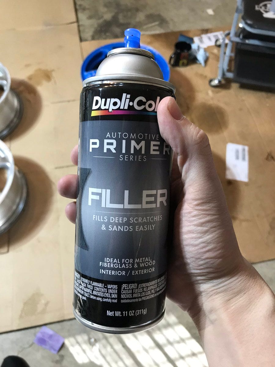 I’m going to prime with this Duplicolor Filler primer to help deal with the light surface scratches all over these wheels.