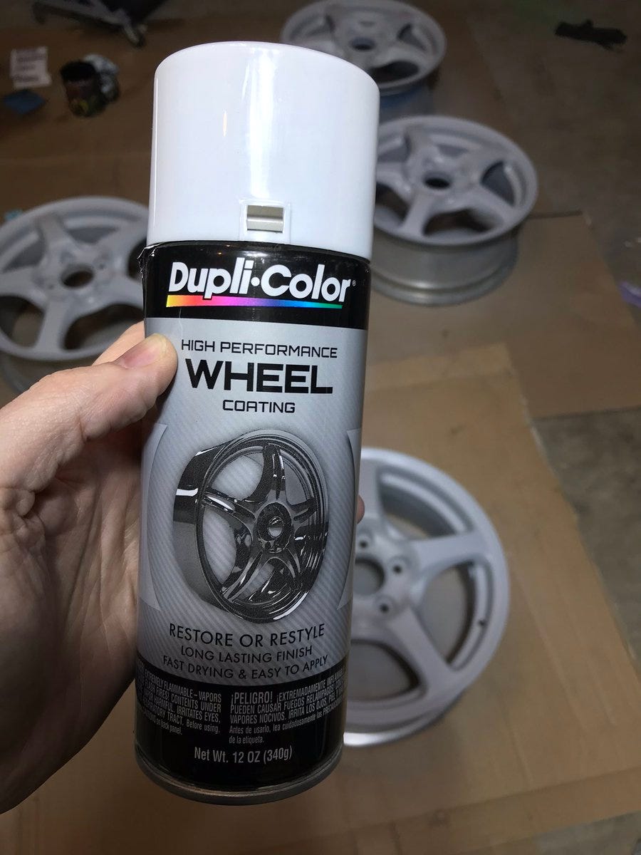 Now it is time for paint. I’m going with white DupliColor Wheel coating for a bold contrast with my “electric blue pearl” CR-V but silver or gun metal would be good color choices too. There’s definitely cheaper paint you could use but durability is important if you don’t want to have to redo this later. I bought 2 cans of paint for the 4 wheels.
