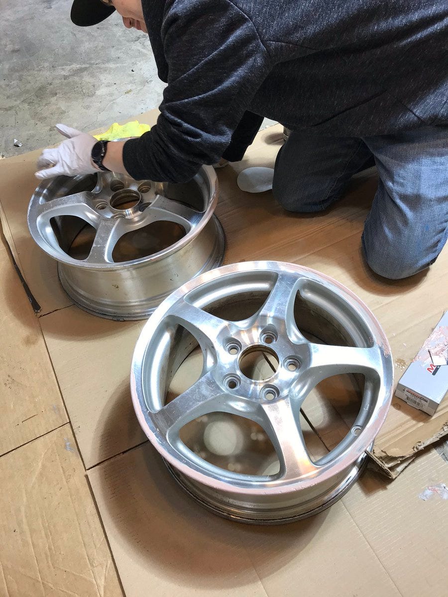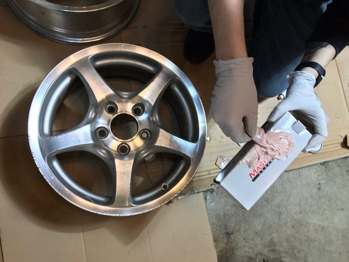Now it’s time to scrub these wheels free of any dust, dirt, oil etc while the Bondo cures. I’ll give the Bondo at least 30 minutes before I touch it.