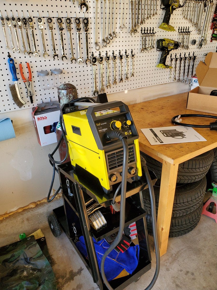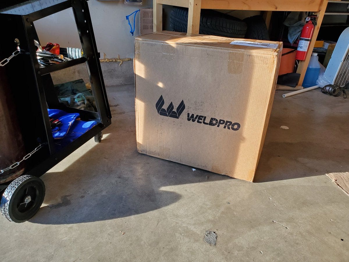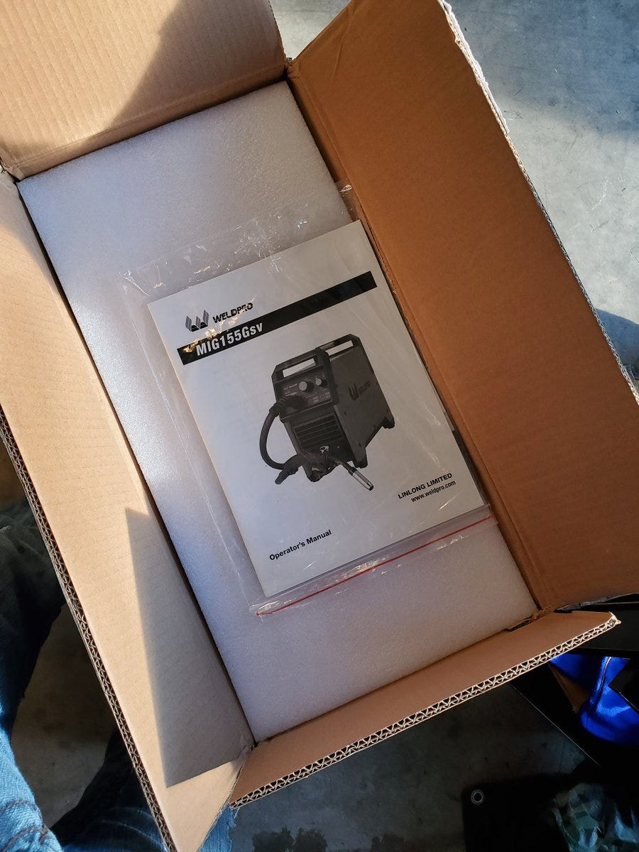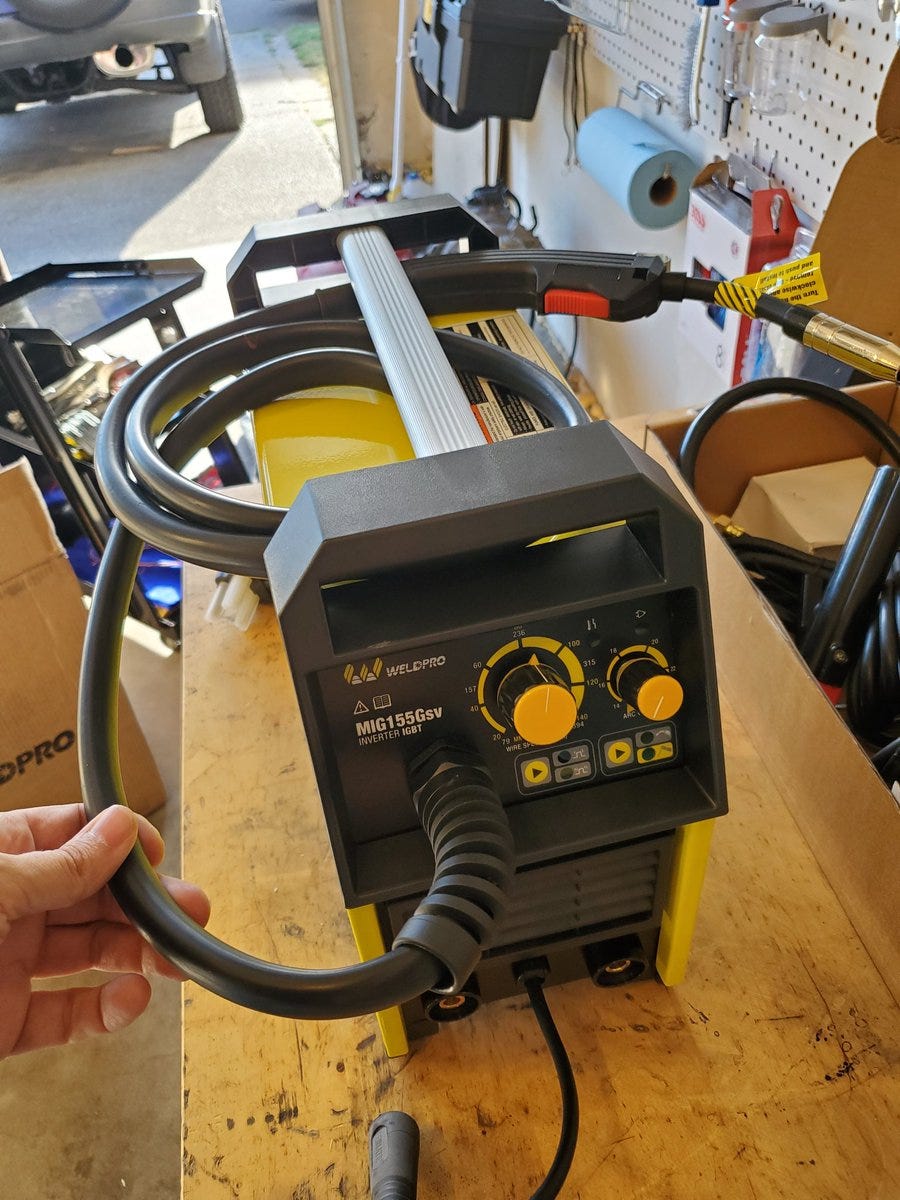 - 4 minutes read - 750 wordsI’ve wanted to learn to weld for years and I finally pulled the trigger on a MIG welder. I picked the WeldPro MIG155Gsv. I knew I wanted a MIG and I wanted something that could run on ~110v and ~220v. This was only $300 and good reviews. Let’s see what’s in the box.