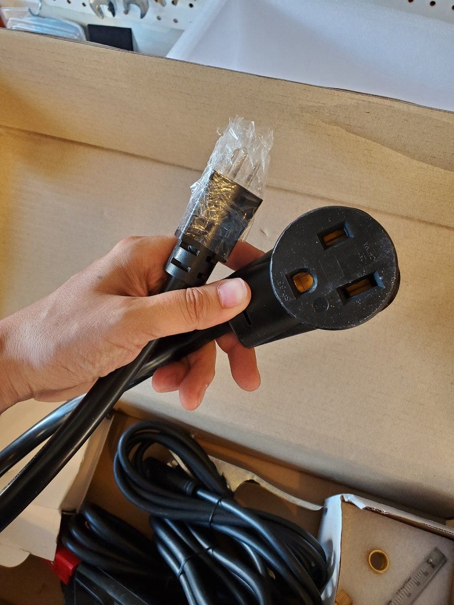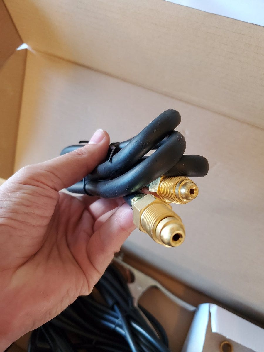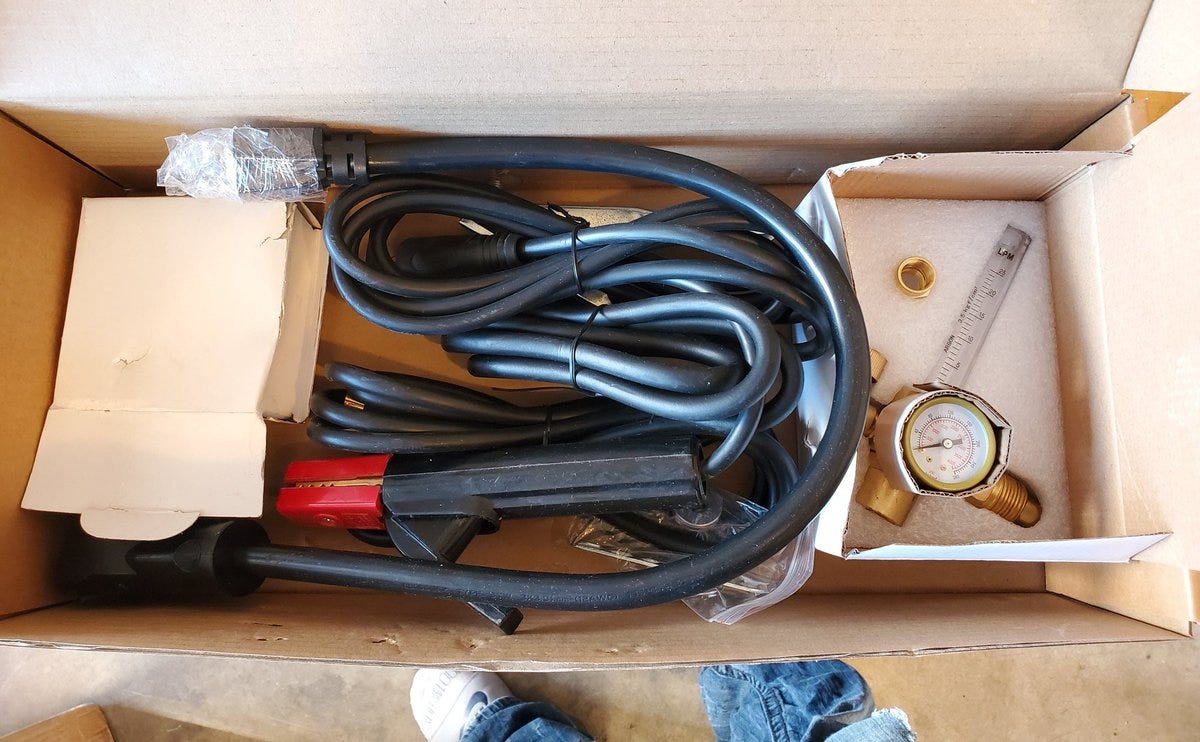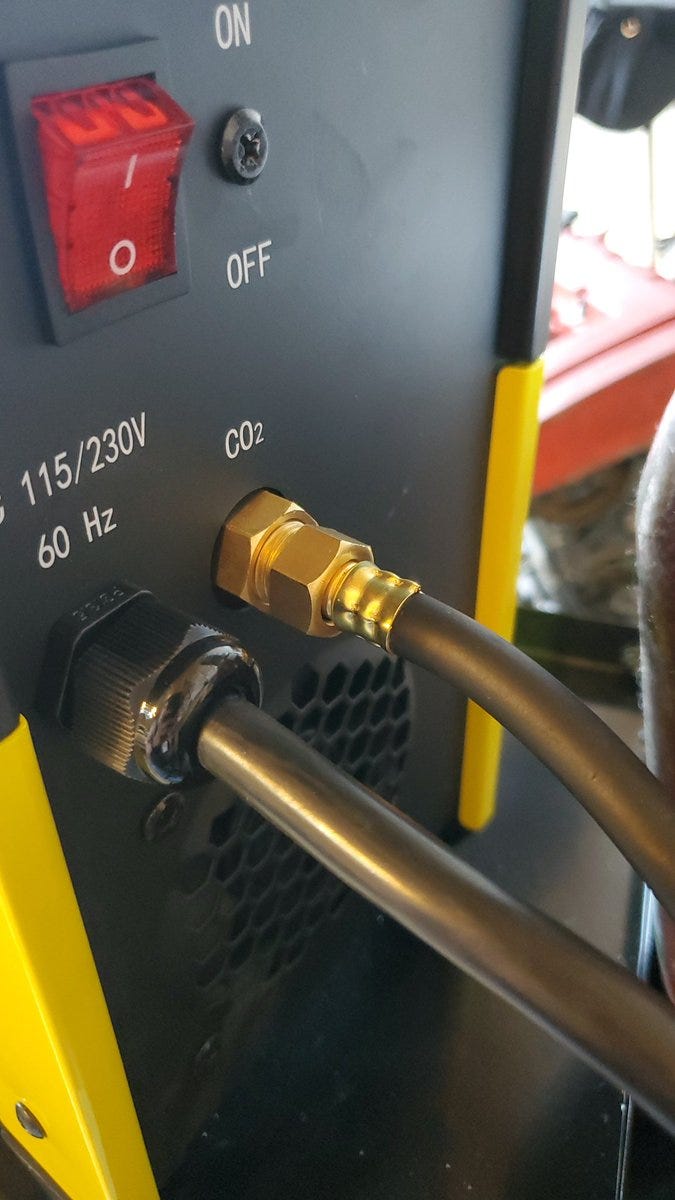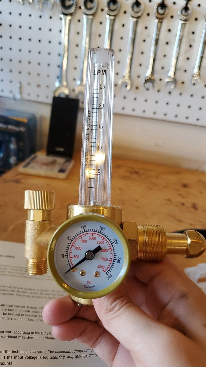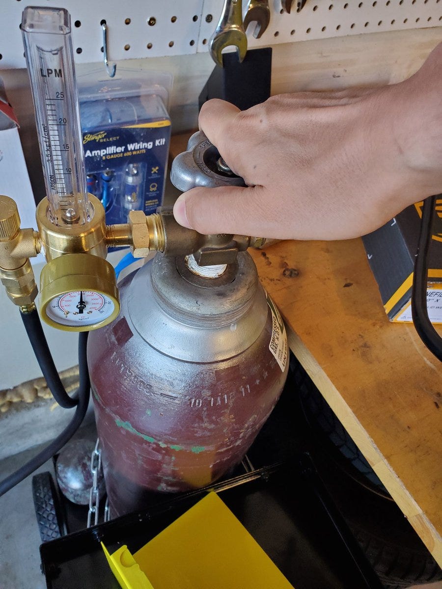 Now I’m opening the tank valve and plugging in the welder. I’ll take this opportunity to remind you that I have never welded, don’t have anyone here teaching me and I’m just reading the manual. 😳