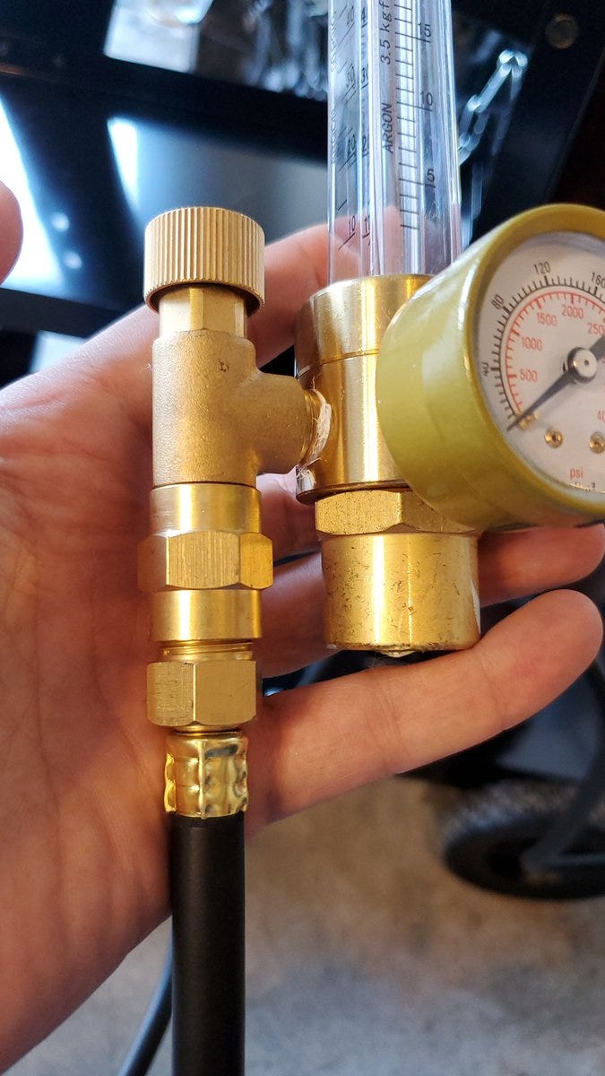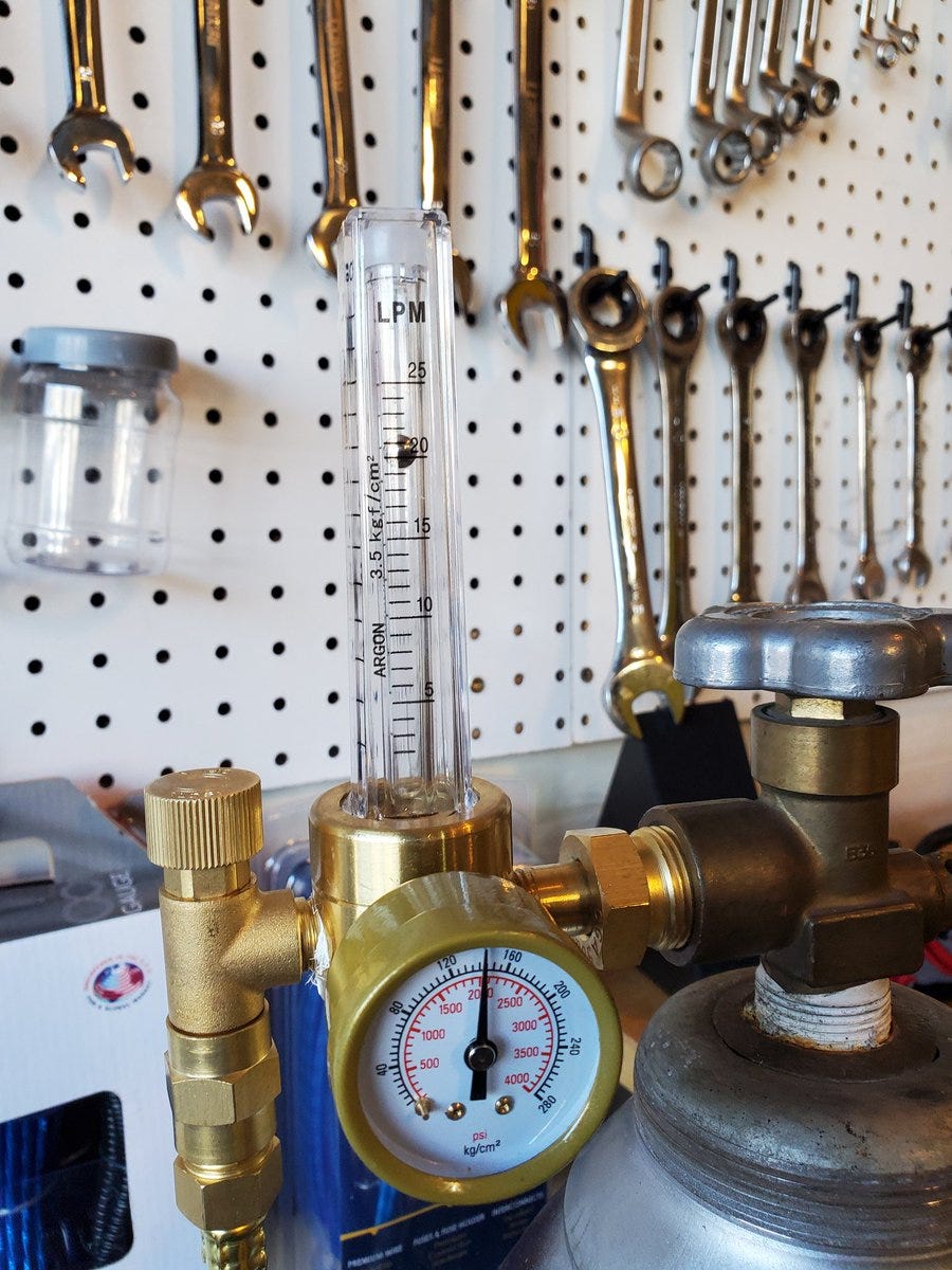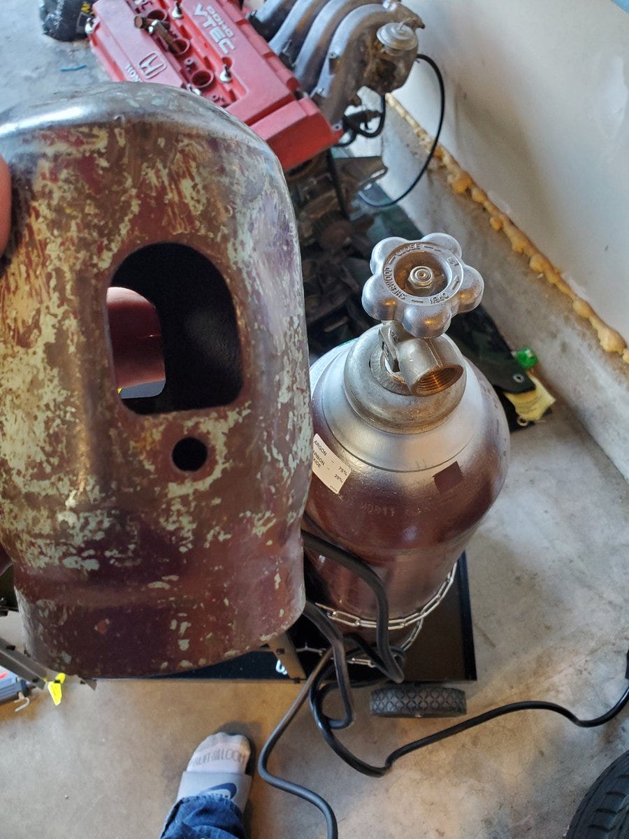 And of course this hefty tank of 75% argon and 25% carbon dioxide from a local welding shop. This cost almost as much as the welder…