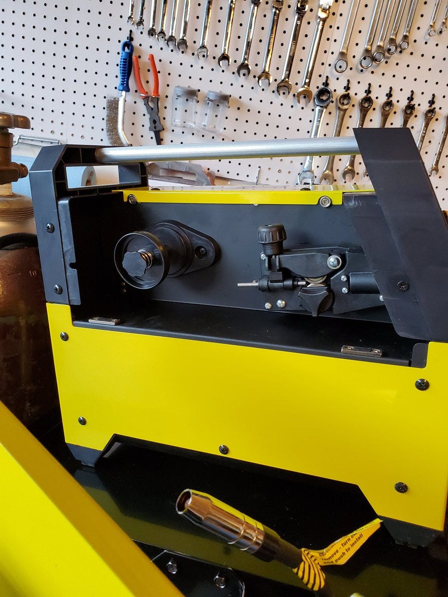 The instructions say the spool should feed from the bottom. Remember those various wheels in that little bag? They go here to feed the wire to the torch hose. There are different wheels for different thickness wire.