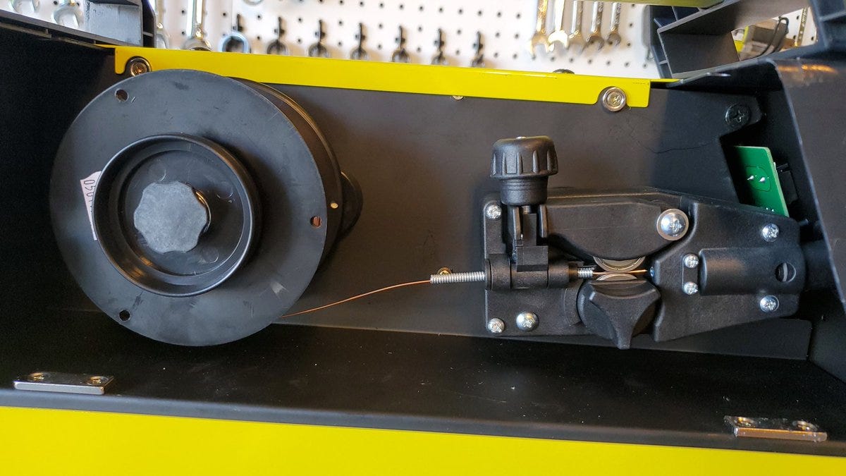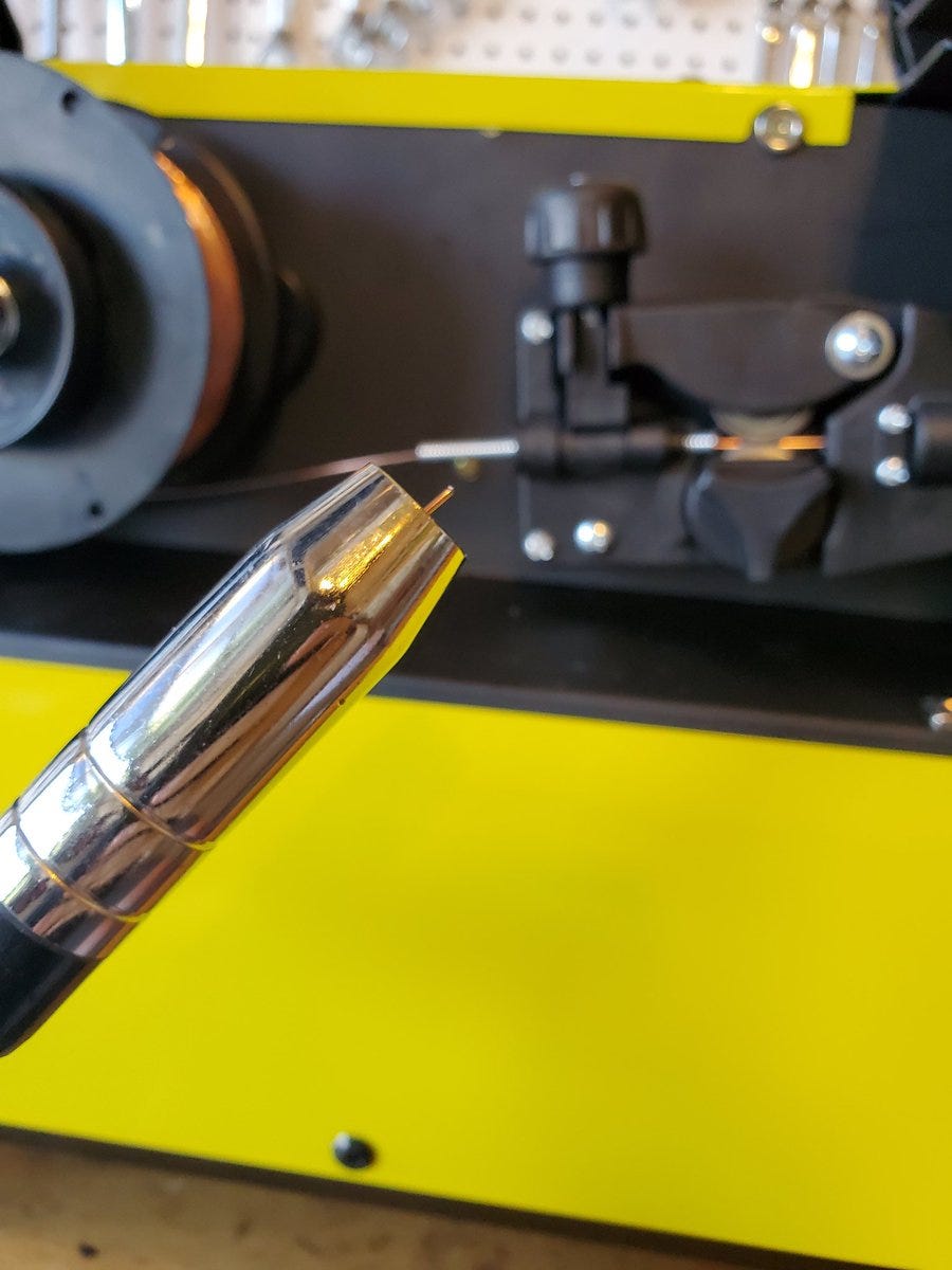 After adjusting the feed tensioner I’ve allowed the welder to feed the wire through to the end of the torch.