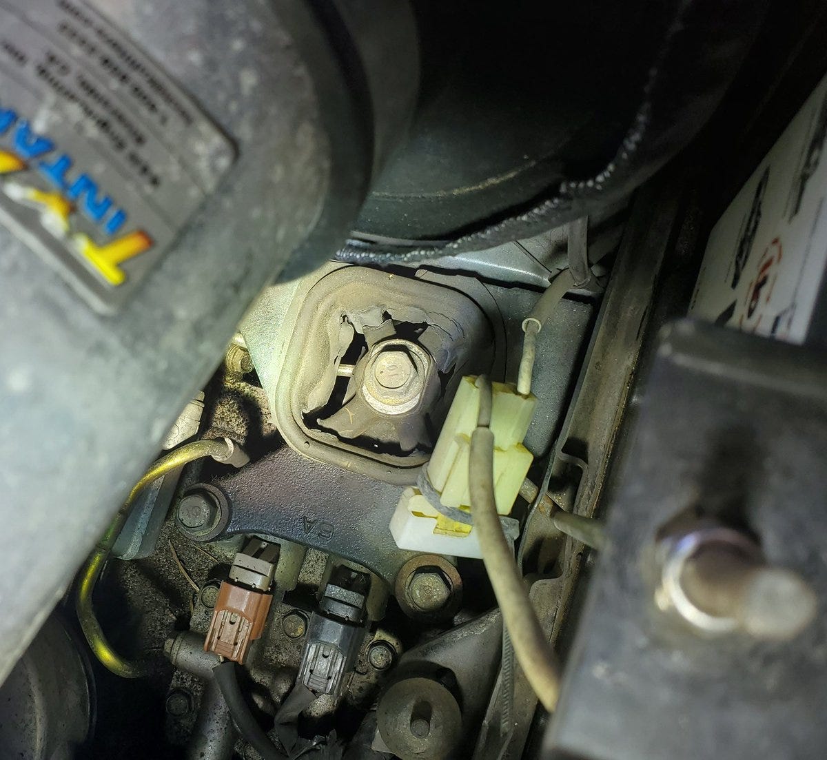 While rooting out the “clunking” sound my 2004 Accord has been making I noticed a very worn looking transmission mount. We can see it is torn in at least 2 places.