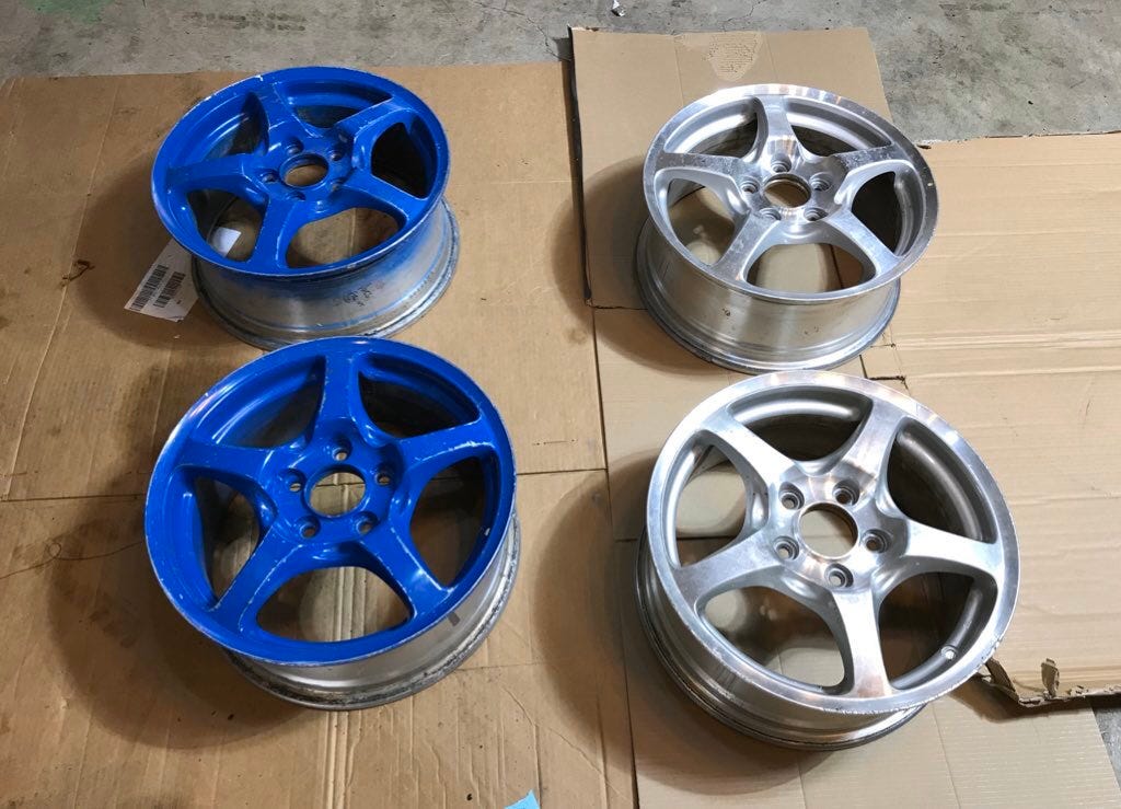 These are OEM 16” x 7.5" Honda S2000 wheels. They’re made in Japan by Enkei. They’re pretty sought after but I got this set for $120 on Craigslist because they are in rough shape and have no tires.