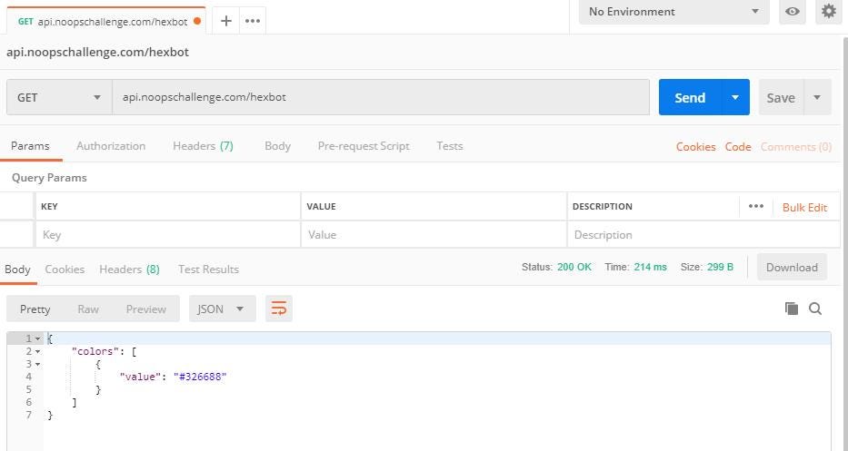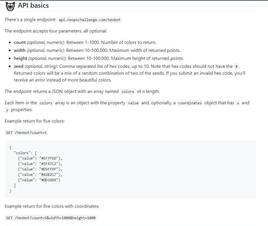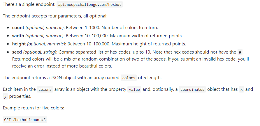 An endpoint is the part of the API that receives requests and does stuff with them. We are going to send a request to the Hexbot API endpoint and get some kinda something back. I don’t know what it’s gonna do yet (api.noopschallenge.com/hexbot)