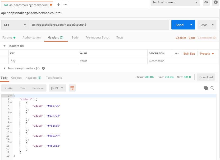 If we add “?count=” to the end of our API request, we can get more colors at once. The new API request will read: (api.noopschallenge.com/hexbot?count=5)