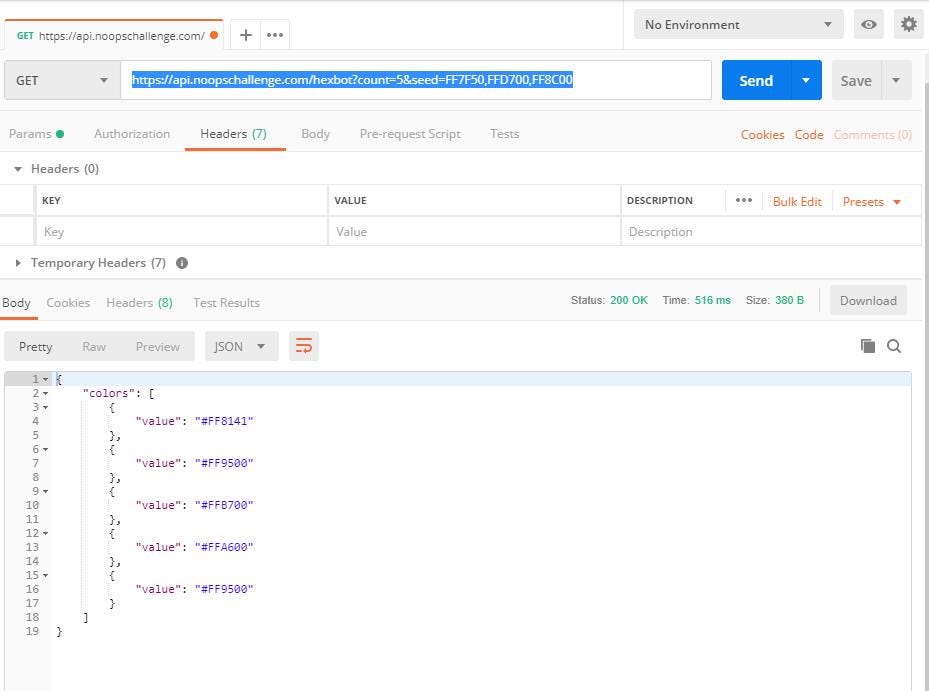 You can also seed the API. The API is not clear what it does with this information. Are we training a world-destroying artificial intelligence? I dunno. But I know based on the Postman GET request output that the API spits out similar-looking hex colors when you seed it this way