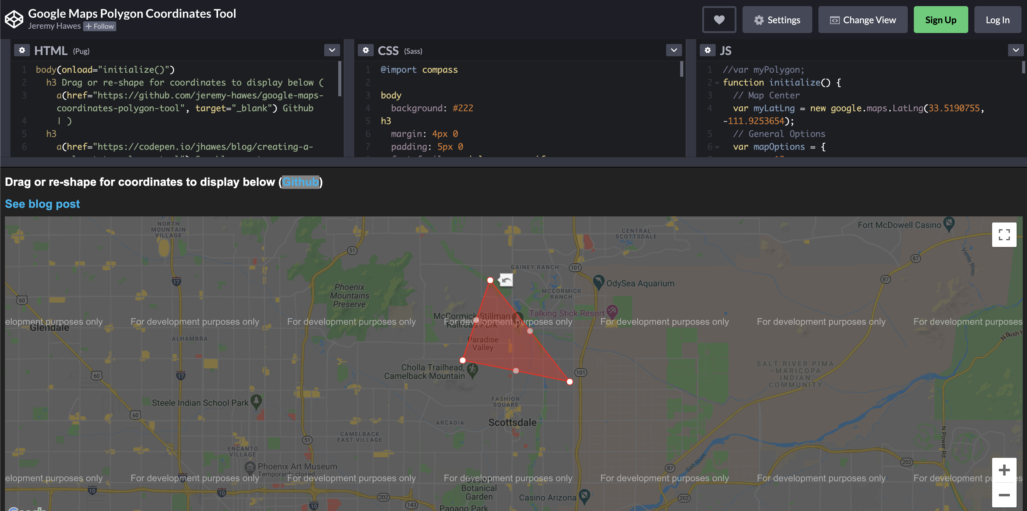 Google Maps provides many public APIs relating to maps (duh). We’ll use an existing open source project that leverages one of their APIs and allows you draw a polygon on the map and returns a set of coordinates. You can play with the Codepen here.