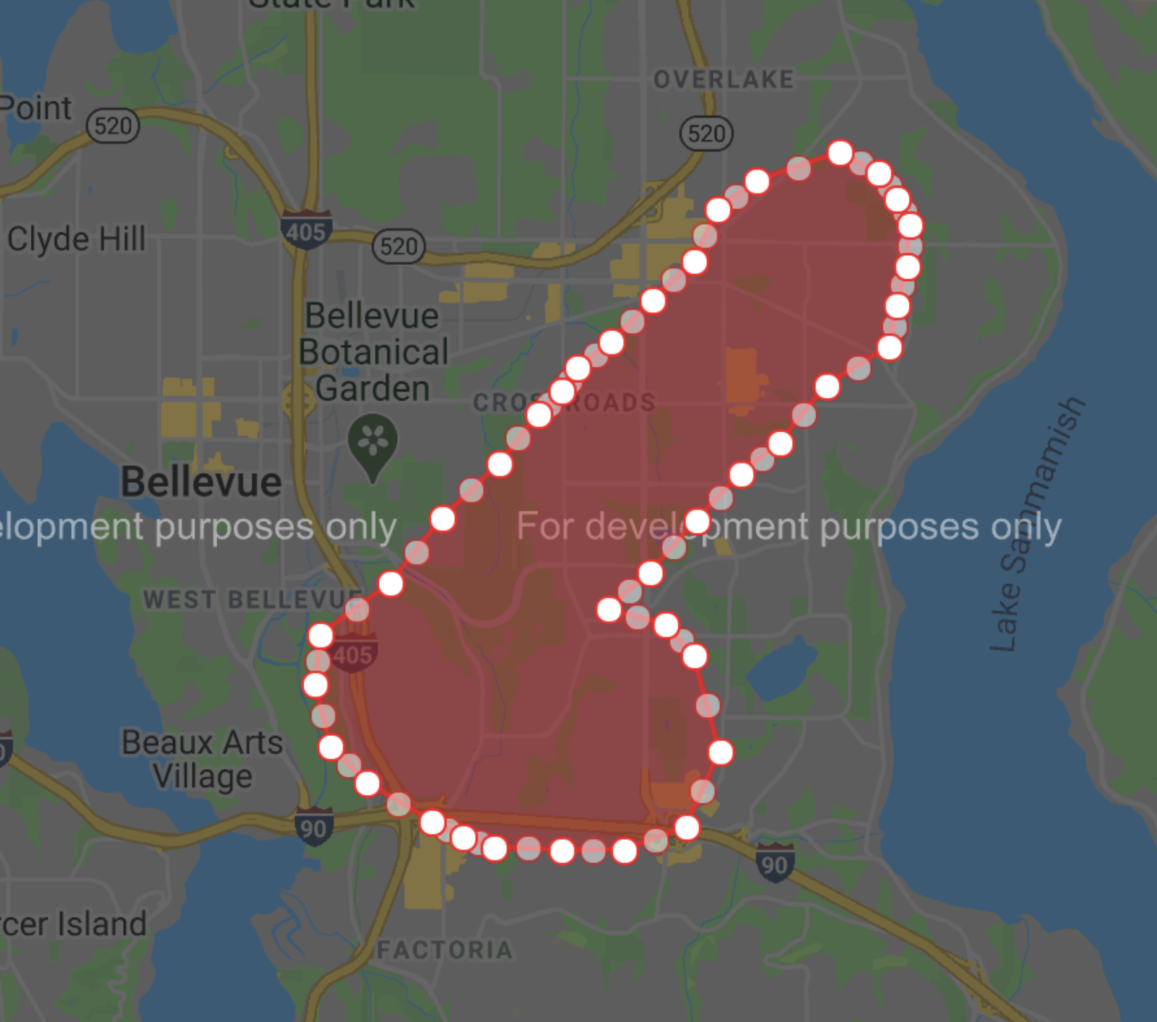 {“47.62266”, “-122.14746”}, {“47.62018”, “-122.15174”}, {“47.61817”, “-122.15405”}, {“47.61615”, “-122.15705”}, {“47.61178”, “-122.16218”}, {“47.60695”, “-122.16971”}, {“47.60096”, “-122.17655”}, {“47.59633”, “-122.18569”}, {“47.5921”, “-122.1864”}, {“47.58649”, “-122.18436”}, {“47.58313”, “-122.17973”}, {“47.57977”, “-122.17097”}, {“47.57843”, “-122.16683”}, {“47.57754”, “-122.16269”}, {“47.57717”, “-122.15372”}, {“47.57715”, “-122.14572”}, {“47.57922”, “-122.13737”}, {“47.58591”, “-122.13304”}, {“47.59462”, “-122.13622”}, {“47.5973”, “-122.1401”}, {“47.59874”, “-122.14784”}, {“47.60208”, “-122.14239”}, {“47.60669”, “-122.13591”}, {“47.61084”, “-122.13012”}, {“47.61355”, “-122.12514”}, {“47.61856”, “-122.11878”}, {“47.62212”, “-122.11054”}, {“47.62575”, “-122.10951”}, {“47.62942”, “-122.1083”}, {“47.63309”, “-122.10779”}, {“47.63536”, “-122.10949”}, {“47.63759”, “-122.11186”}, {“47.63952”, “-122.11729”}, {“47.63689”, “-122.12815”}, {“47.6343”, “-122.13332”}, {“47.62986”, “-122.13643”}, {“47.62634”, “-122.14194”}