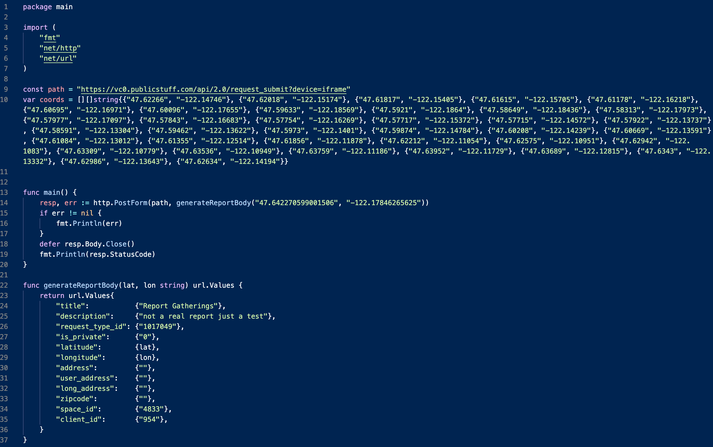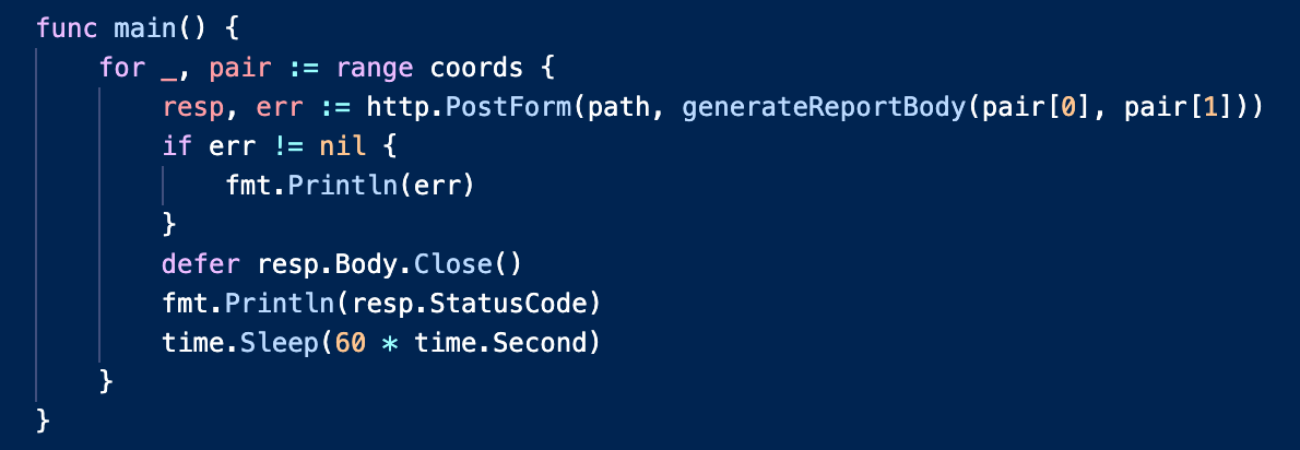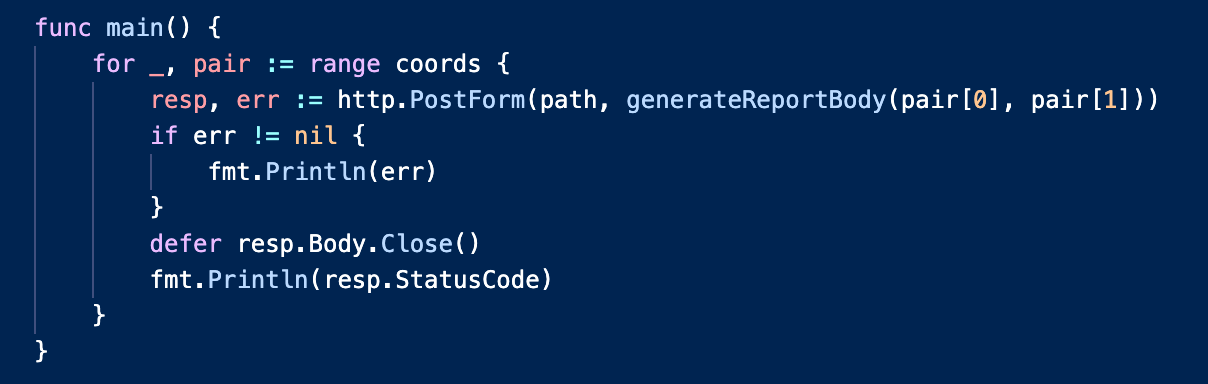Now that we can generate the arguments we need for our HTTP request, let’s fill out the main() function to do just that using the same latitude and longitude from that park earlier. We’re not animals so we’ll check for errors and print any we find, but more importantly we’ll print the HTTP status code we get from our POST request. You can read more about HTTP requests in Go here.