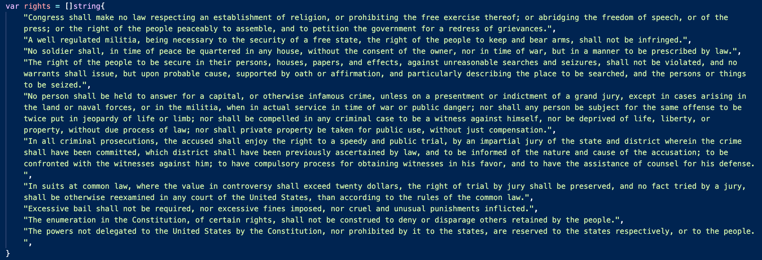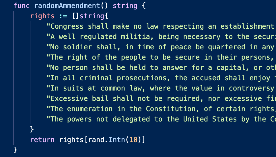 First, we’ll need to gather the first 10 amendments into a slice of strings.