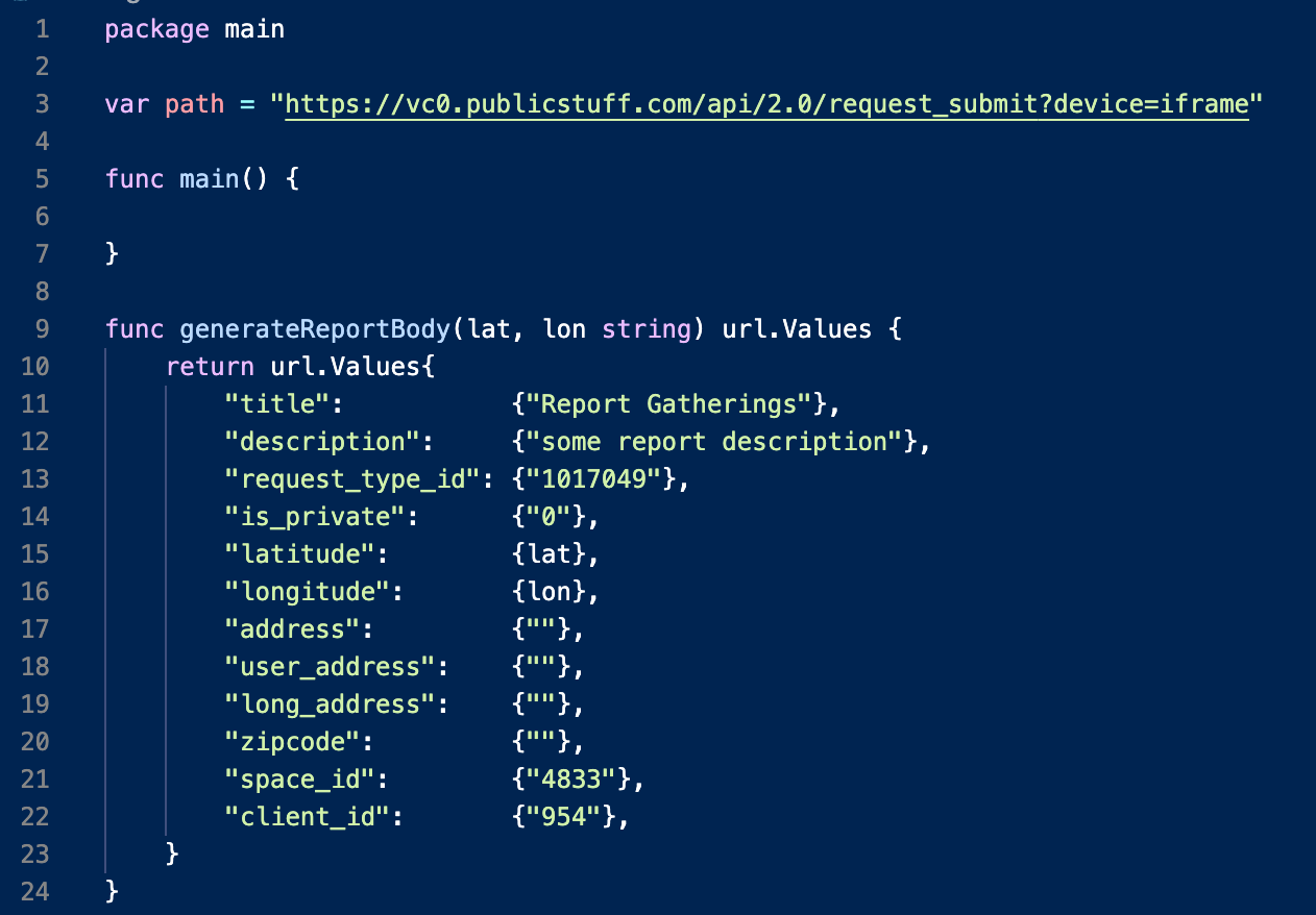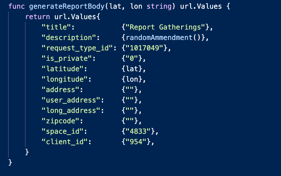 From the form data we got found in the network tab we have values for space_id, client_id, request_type_id. We don’t know exactly what those values mean but since we weren’t logged in or authenticated in any way “client_id”: “954” is probably the code for an anonymous report, maybe? And request_type_id almost certainly refers to the “gathering” type of report (Bellevue lets you report other things as well like… Lime Bikes for some reason). Whatever these numbers mean, we’re going to hard code them to match what we saw in our test report.