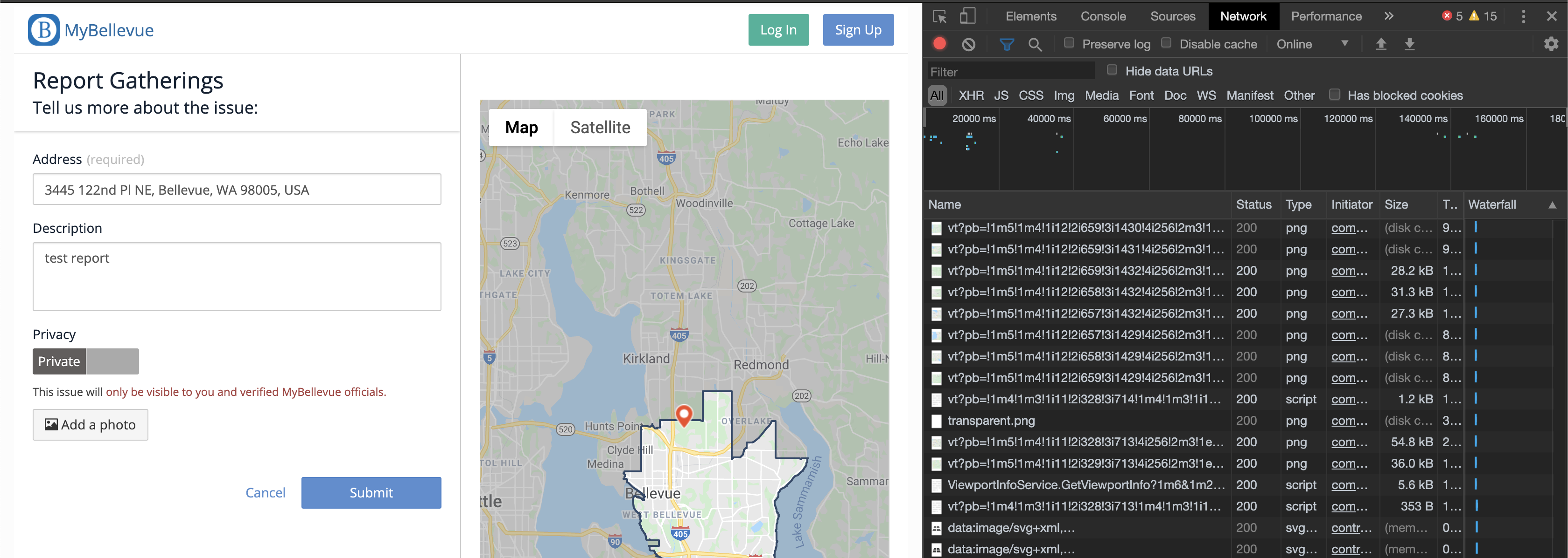 As always, to see what a website is doing, go to the page and open up the network tab! The site allows you to enter an address, add a description, and optionally add a photo. Instead of an address you can also drag a pointer on the map. I’ll drag the pointer to a park; the page automatically updates with an address when you move the pointer. The page has no warnings about submitting false reports (do not confuse this with a real “police report”) but just so no one thinks this is real and acts on it I’ll add “test report” as the description.