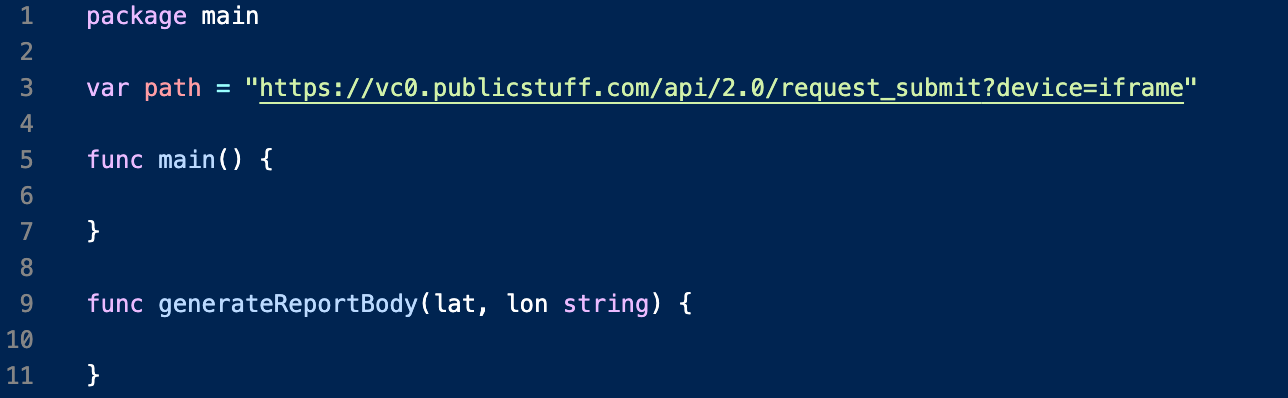 What we really care about is the latitude and longitude! We’re going to be using the PostForm() function from Go’s http package. Since this function takes a url.Values type as an argument we’ll have our function return a urls.Values type. This type is based on a map of a string/slice-of-string (map[string][]string) so we can populate our url.Values literal like this, inserting our latitude and longitude values as strings: