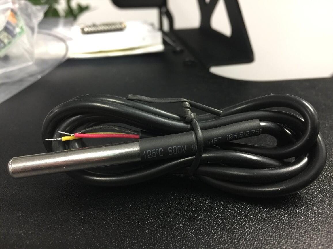 A temperature sensor that plugs right into the breadboard. You could use this, e.g., to test the temperature outside your house and automatically turn on your sprinkler system when it gets hot out. Protect those petunias.