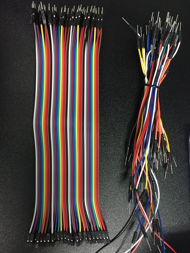 A whole grip of cables, dog. These are pretty beautiful when they’re all attached like this, it’s going to be painful to tear them apart to actually use them. Male->Male Jumpers tied up with a twist-tie, and a strip of Male->Female Jumpers