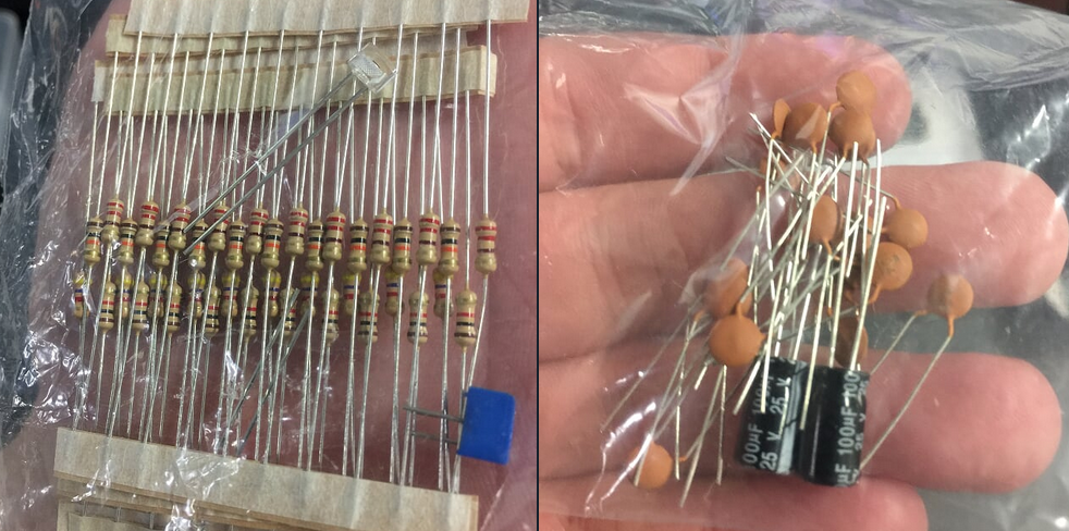 A buncha little resistors, a couple photoresistors, some ceramic capacitors, and electrolytic capacitors. I’m gonna be real. I have no idea what an electrolytic capacitor does. I just plug them in when The Googles tells me to #realtalk