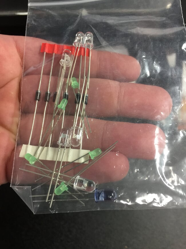 Here’s the LEDs. A bunch of solid-color LEDs, one RGB LED (might use this for status lights e.g. on the front of a computer/server), and apparently one of these is an Infrared LED. Is that like the ones on your TV remote? I can’t wait to try that sucker out.